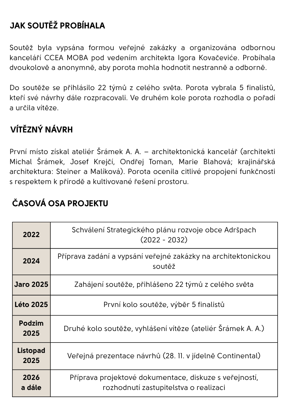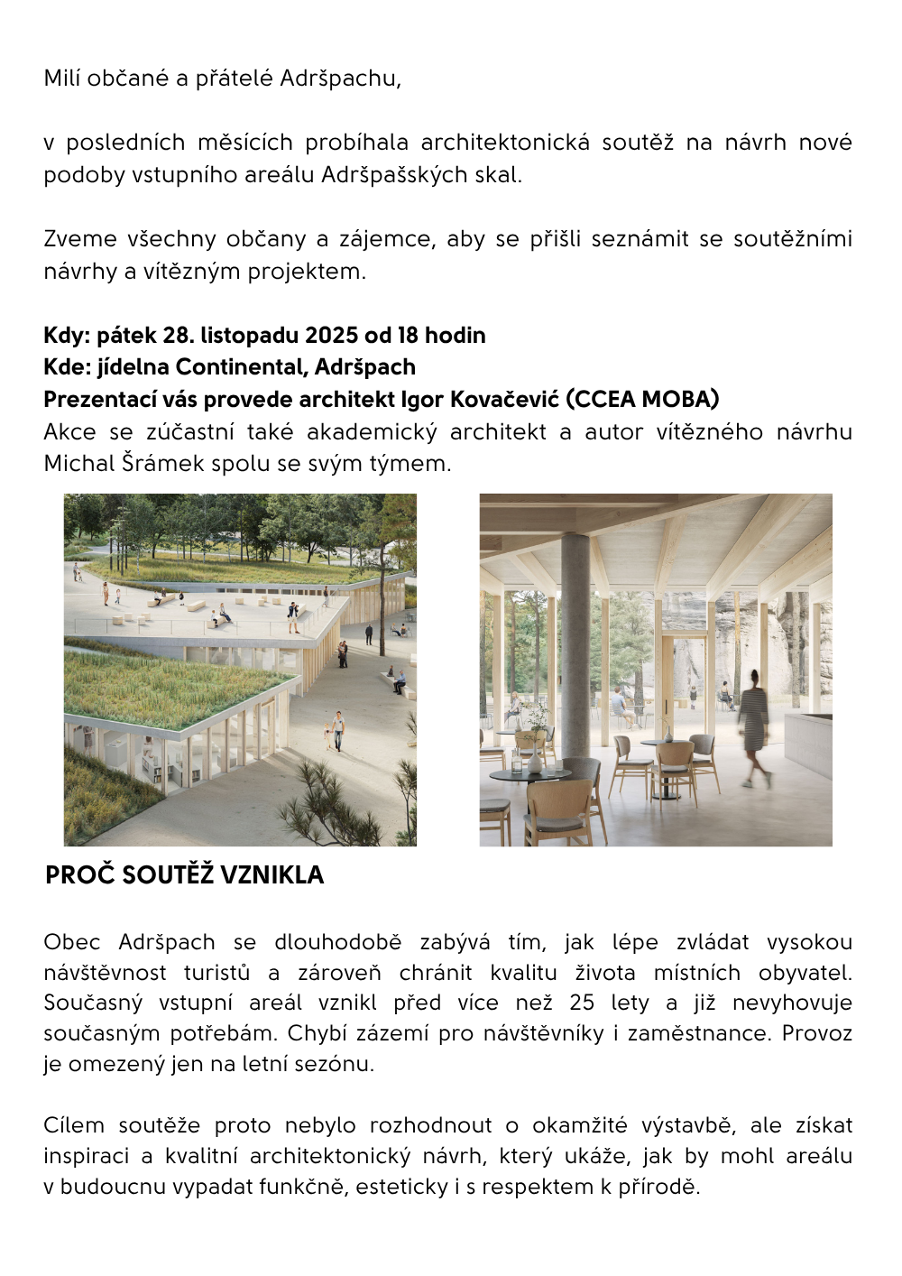v posledních měsících probíhala architektonická soutěž na návrh nové podoby vstupního areálu Adršpašských skal. Zveme všechny občany a zájemce, aby se přišli seznámit se soutěžními návrhy a vítězným projektem.