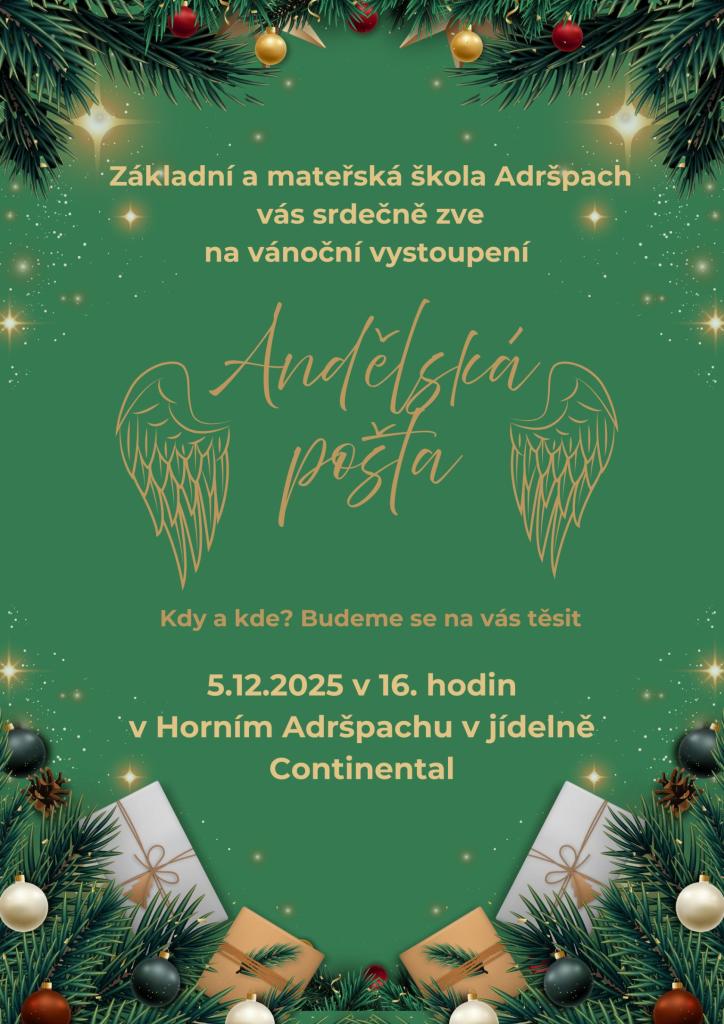 Základní a mateřská škola Adršpach vás srdečně zve na vánoční vystoupení, které se koná 5. prosince 2025 v 16. hodin v jídelně Continental v Horním Adršpachu.